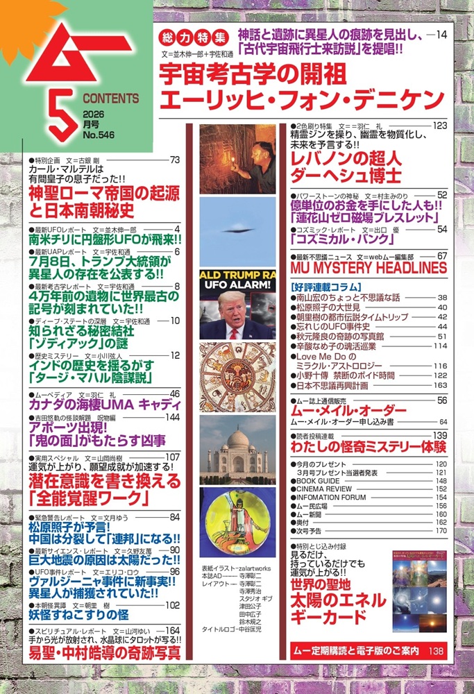 高度な文明を持つ異星人は、太古より何度も地球に降り、人類に影響を与えてきた。世界各地に残る古代遺跡や遺物、神話伝説には、その名残であるとする「古代宇宙飛行士来訪説」、いわゆる「宇宙考古学」である。今月の総力特集では、その開祖、エーリッヒ・フォン・デニケンの唱えた興味を掻き立ててやまない所説を振り返る。