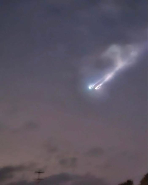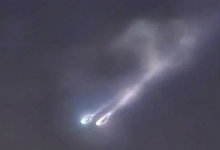 海外掲示板「reddit」に1枚の写真が投稿された。そこには闇夜の中、尾を引きながら斜めに落ちていく2つの光が写っている。1つは白い光、もう1つは青みを帯びた光で、並行して飛んでいるようにも見える正体不明の飛行物体だ。