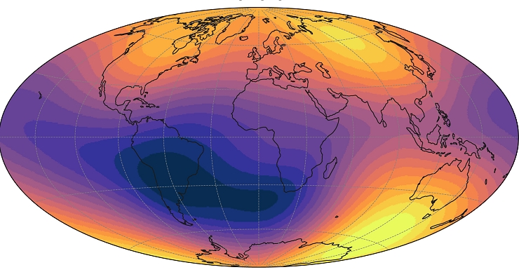 地球の磁場が著しく弱い領域である「南大西洋異常帯(South Atlantic An、SAA)」は、南米とアフリカにまたがる範囲に広がっていることが19世紀に判明している。この領域では、地球を取り巻く放射線帯(ヴァン・アレン帯)の高度が低くなっており、同領域を通過する人工衛星や国際宇宙ステーション(ISS)が通常よりも多くの高エネルギー粒子に晒されてしまう。そのため、機器の故障や誤作動を引き起こす可能性が高まるのだ。