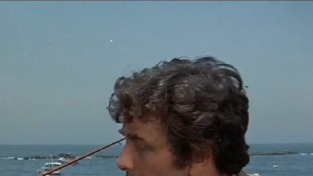 問題のシーンを見てみよう。カリフォルニア州サンタモニカ、コロラド・アベニューからビーチへと突き出した大きな桟橋サンタモニカ・ピアにあるオーシャン・サイド・イースト・カフェで、事件について会話を繰り広げるコロンボ(ピーター・フォーク)と探偵のダブス(ヴァル・エイヴリー)。彼らの背後に広がっている雲ひとつない青空に、明らかに異質な“何か”が姿を覗かせるのだ。