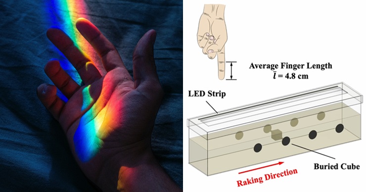 人間を対象にした実験では、参加者は砂の下に埋もれている物体(立方体)を砂を撫でるだけで感知することができ、人間の手が予想以上に敏感であることが確認された。