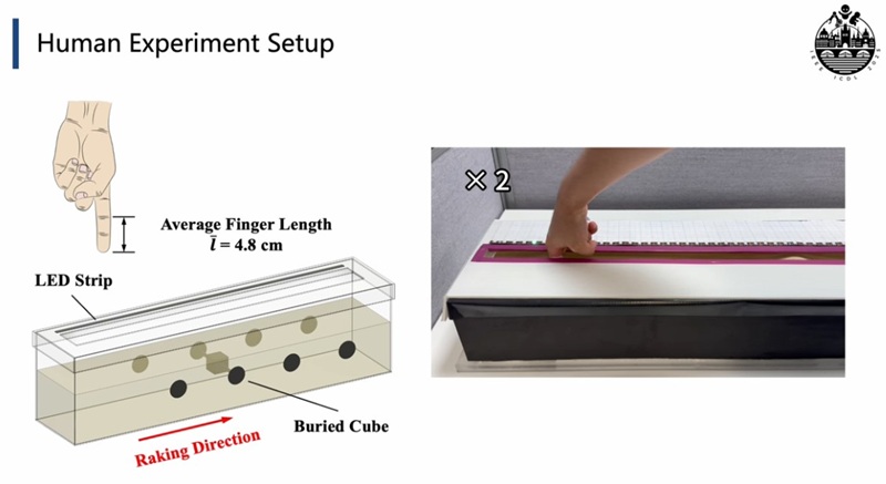 人間を対象にした実験では、参加者は砂の下に埋もれている物体(立方体)を砂を撫でるだけで感知することができ、人間の手が予想以上に敏感であることが確認された。