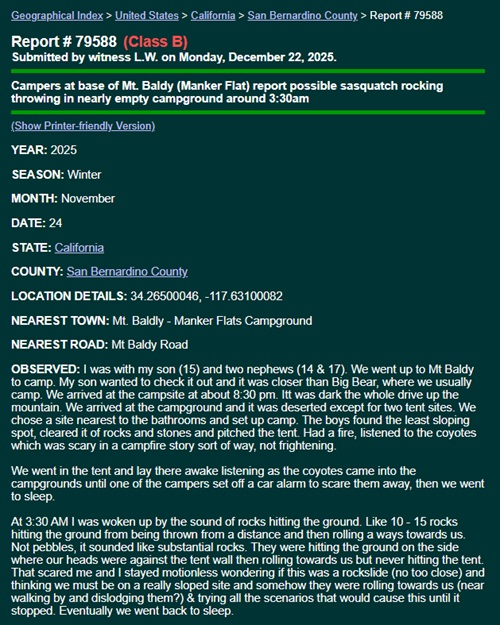 母親は当時を改めて振り返り、「コヨーテとは明らかに異なる、長く低い遠吠えも聞こえていました」と語っている。後日、姉にこの恐怖体験を打ち明けたところ、バルディ山周辺では以前からビッグフットの目撃談が相次いでいることを教えられたという。彼女は専門家に分析を依頼するべく、BFROに報告。その結果、今回の事例は「クラスB」に分類された。