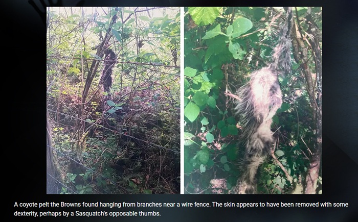 これまでにブラウン夫妻が発見した異変は、視覚的な記録だけでは終わらない。撮影地点の周辺ではコヨーテの毛皮が何者かによって枝に吊るされた状態で見つかり、全長約42cmにも及ぶ巨大な足跡までついていた。毛皮は丁寧に剥がされており、単なる野生動物の仕業とは考えにくい状態だった。