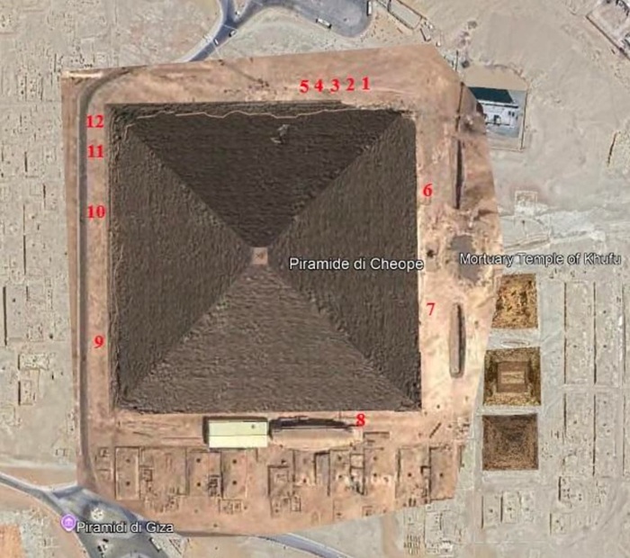 ドニーニはクフ王のピラミッド基部に12か所の測定点を選定し、それぞれを比較。ポイント1では、侵食された体積の比較から5708年前との計算結果が得られた。また、ポイント2では1万7955年前、ポイント5では3万375年前、さらにポイント9では5万4000年前……と大きく異なる年代が示唆される結果に。しかしこの相違は、侵食に影響する変数(方位・気候変動・人の往来など)の多様さから予想されていたことだという。各ポイントで数値が異なるのは当然として、全測定値の平均値が最も信頼性の高い数値となる、これこそがREMなのだ。
