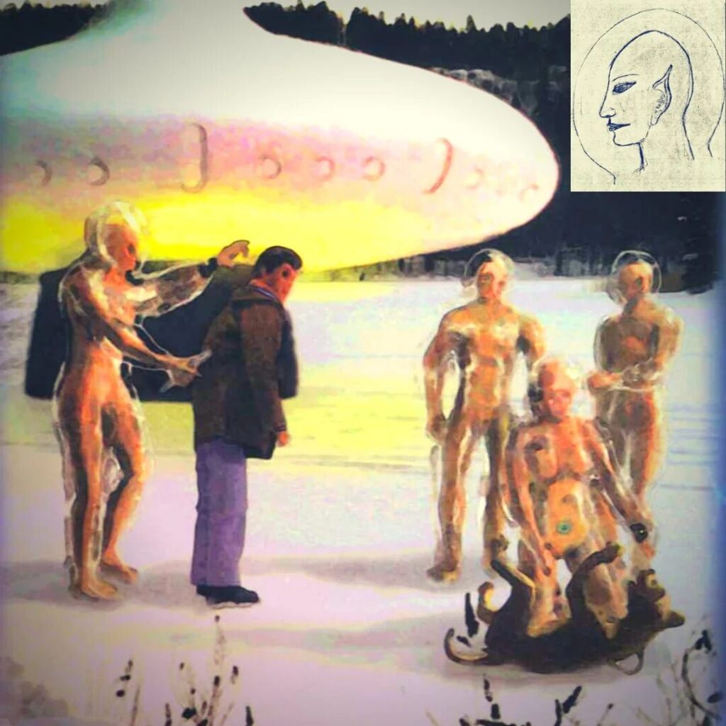 UFOは甲高い音を発して着陸し、その搭乗員は完全に毛が無く、全身を透明なカバーに包まれていた。円筒物を持って目撃者に近づき、地面に絵を描き、やや友好的に、だが子供っぽく振る舞った、という共通点だ。