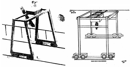 「橋の形をしたクレーンのような巨大重機が視える。クレーンには車輪が8個あり、レール上を移動している」