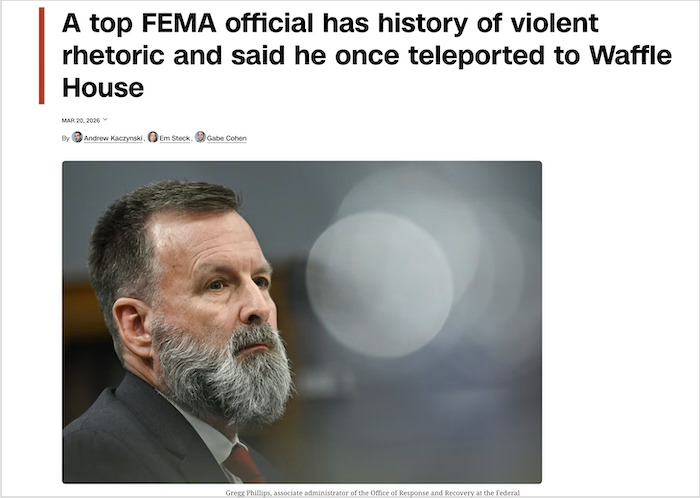 今年1月、大規模なハリケーンが米国を襲った際、フィリップス氏はFEMAの指揮センターで国土安全保障長官の隣に立ち、災害対応の中心人物として活躍した。当初FEMA内部では、彼の過激な発言歴から懸念の声が上がっていたが、積極的に現場を指揮したことで一部の職員は「FEMAにとって最大の希望だ」と評価を改めたという。