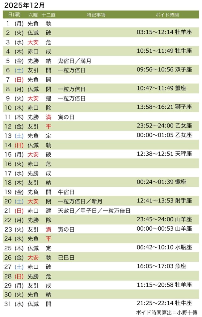 物事を執り行う日。祝い事、祭祀、種まきは吉。旅行や金銭の出入りは凶。
