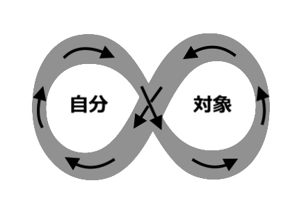 このワークでは、あなた自身を8の字の片方の円内に置き、関係改善を望む対象をもう片方に置いて、8の字状にエネルギーが循環しているとイメージします。それだけで、あなたと対象との間にエネルギーが通います(図参照)。